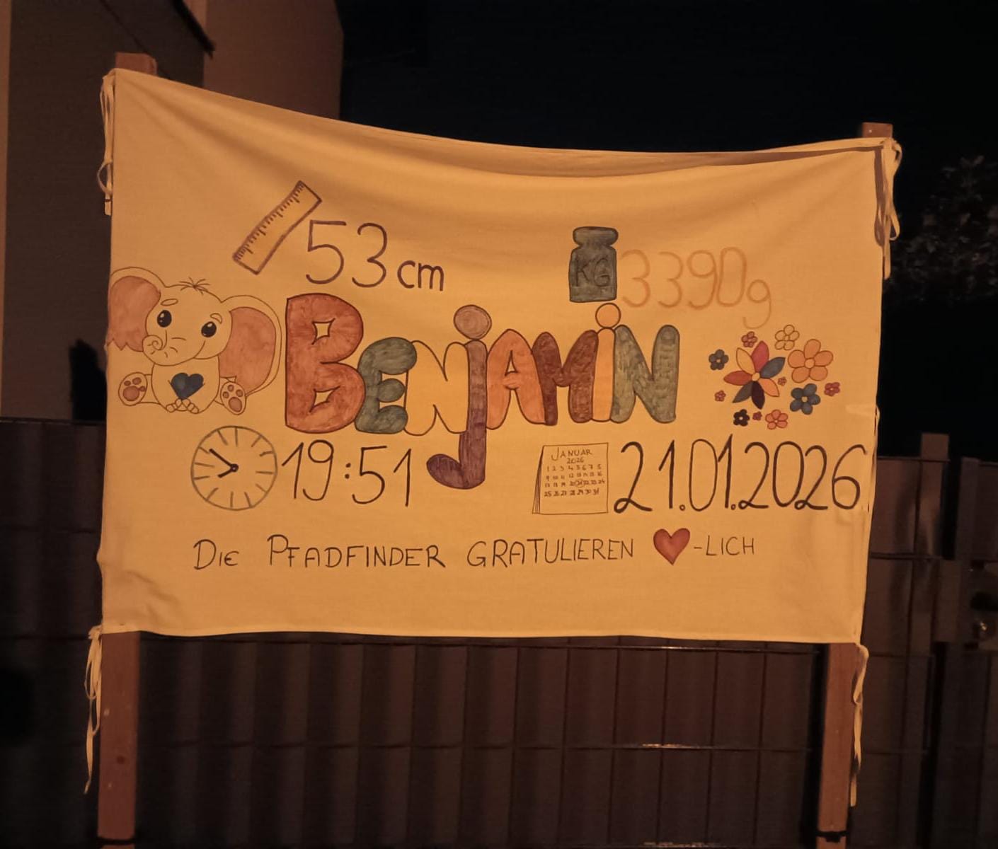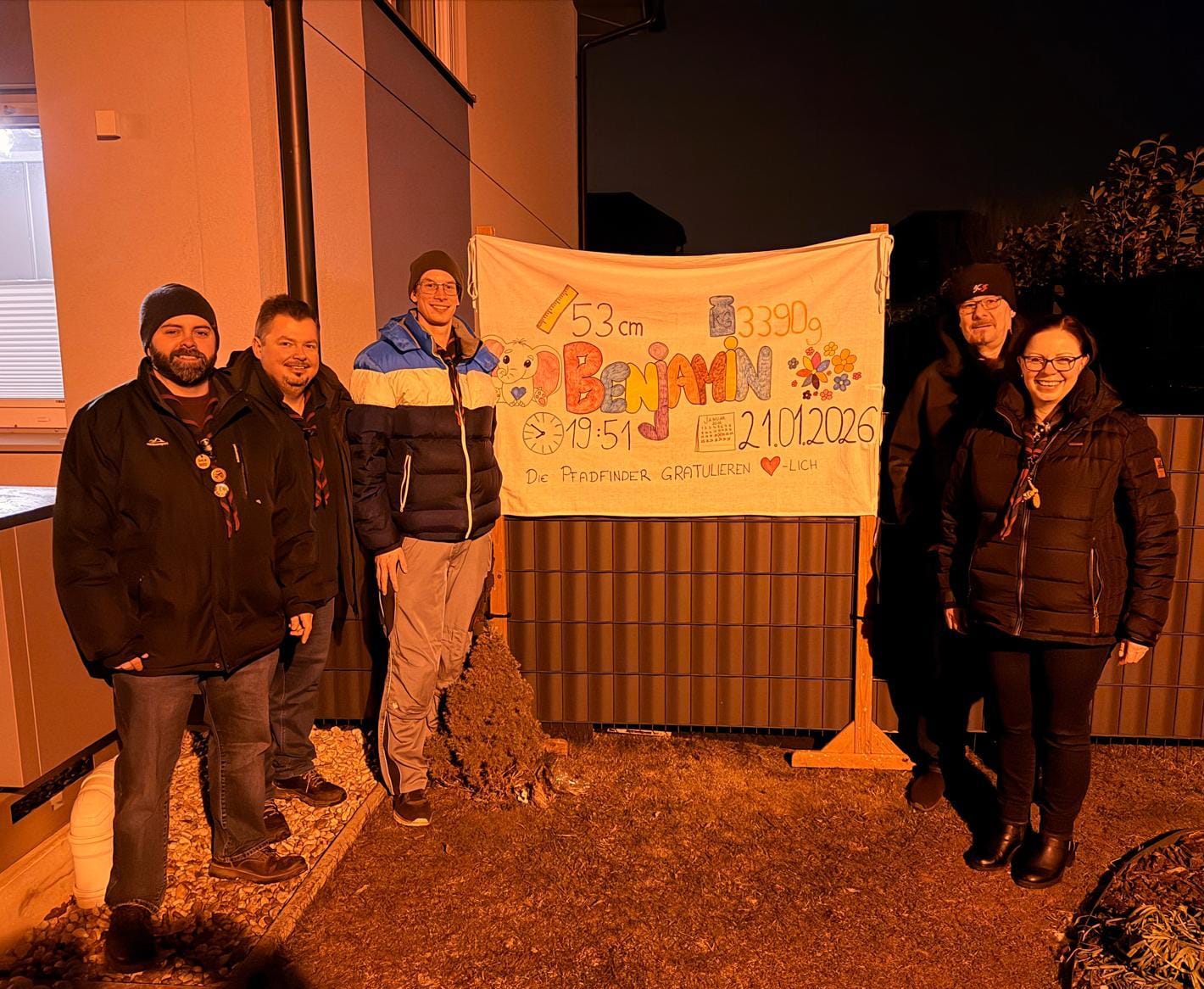 Der kleine Benjamin erblickte am 21.01.2026 um 19:51 Uhr, mit einem Gewicht von 3390g und einer Körpergröße von 53 cm, das Licht der Welt. Als die erfreuliche Nachricht die Runde machte, schloss sich eine Gruppe der Pfadis zusammen um den kleinen Jungen mit einem Leintuch willkommen zu heißen.